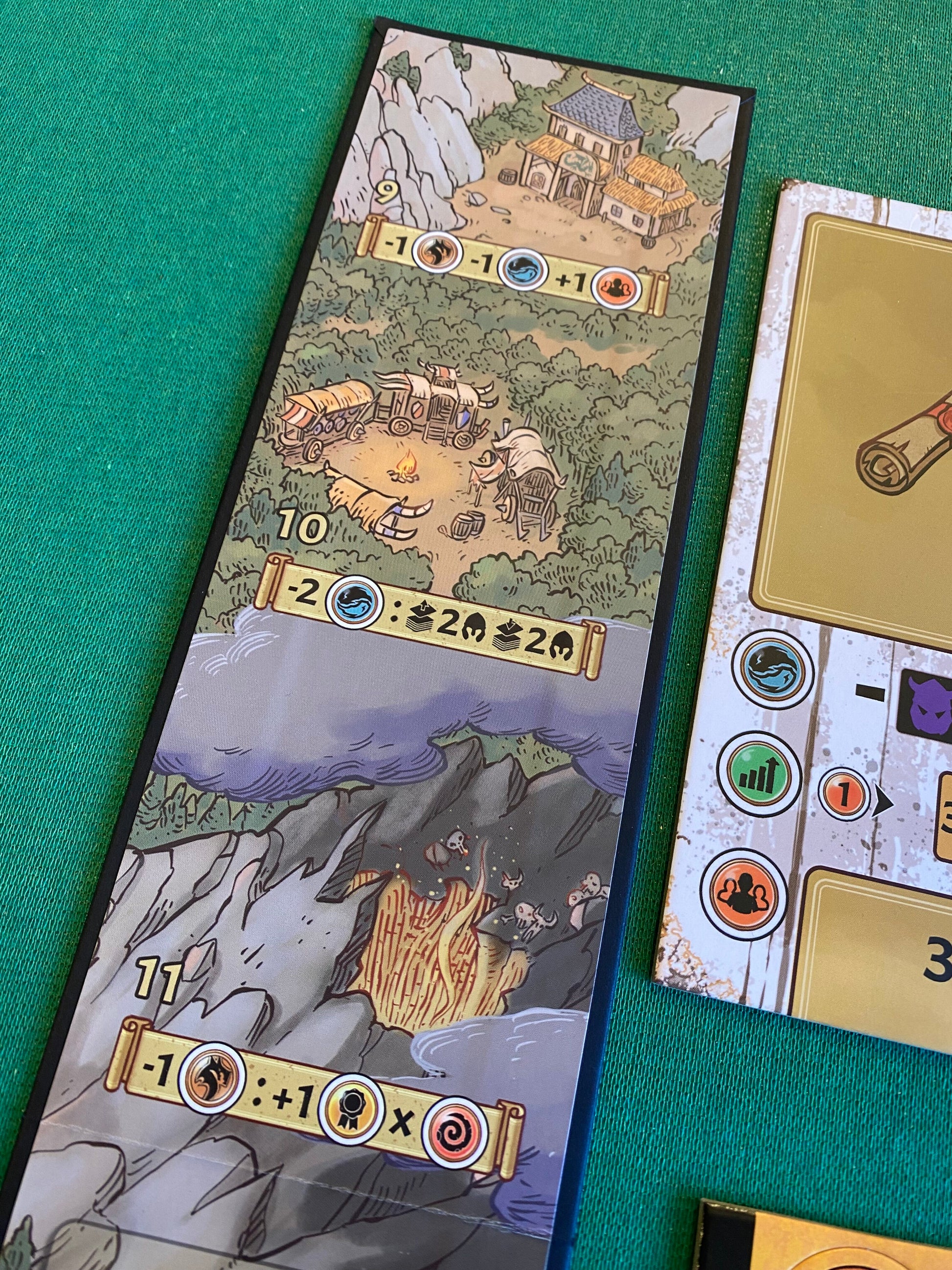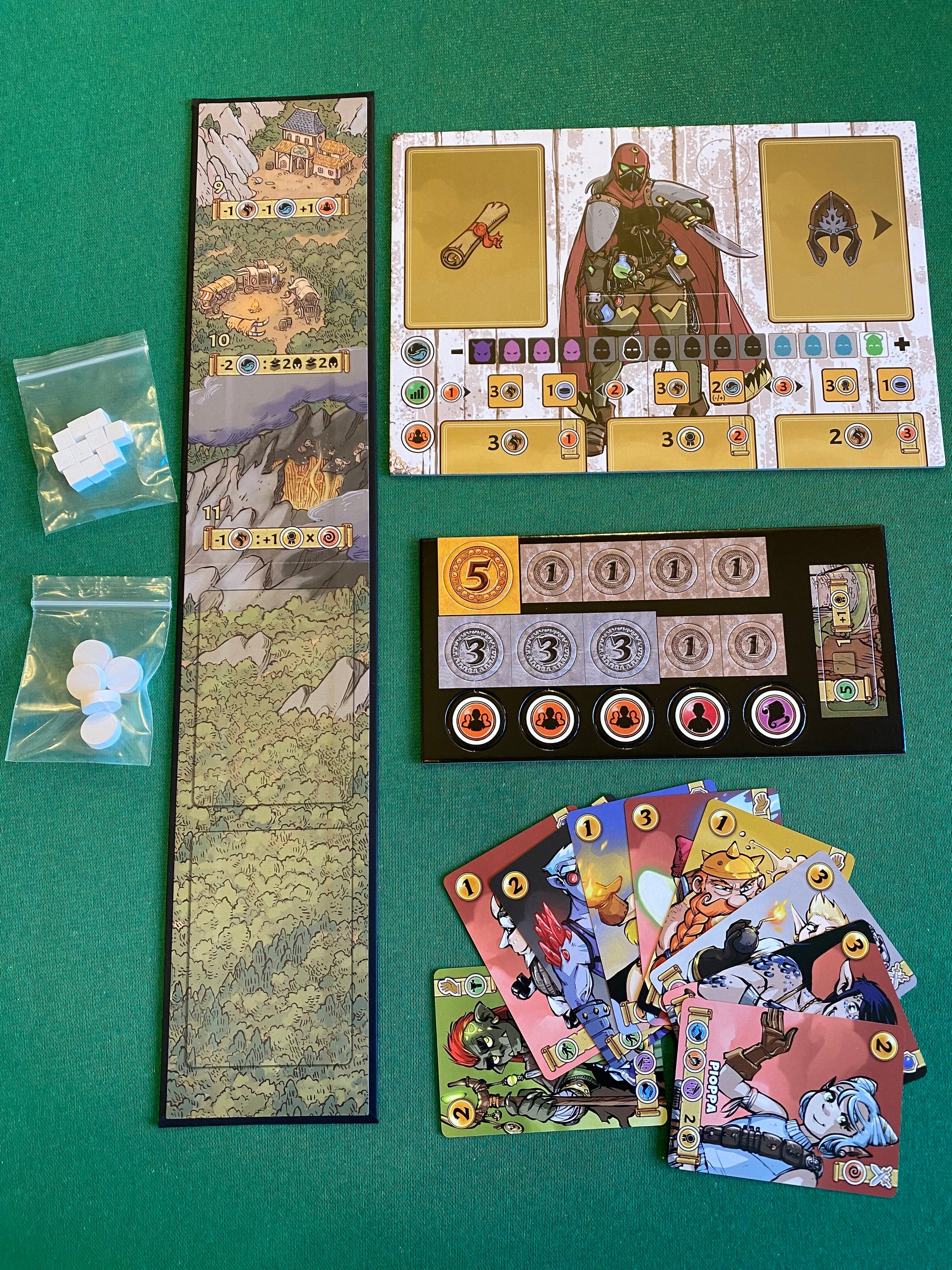 1 Dark Forest board, 9 Adventurer cards, 1 Magic Scroll token, 1 New Recruit token, 3 Ally tokens, 10 wooden cubes, 5 wooden Action tokens, 1 player board.