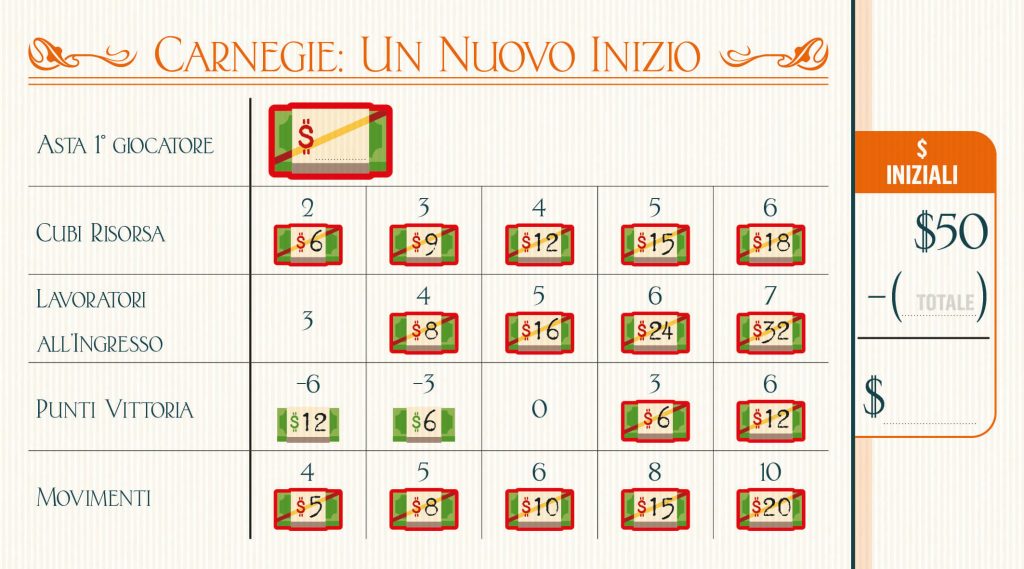 Expansion set for Carnegie composed of four independent modules. Each module can be added to the base game individually or in combination with the others. The first module ("A New Beginning") employs a notepad that contains a table with new offerings and allows customization of each player's starting resources to introduce an element of asymmetry at the start of the game. The second module introduces 16 new departments, the third module new donations and the fourth module adds some optional rules.