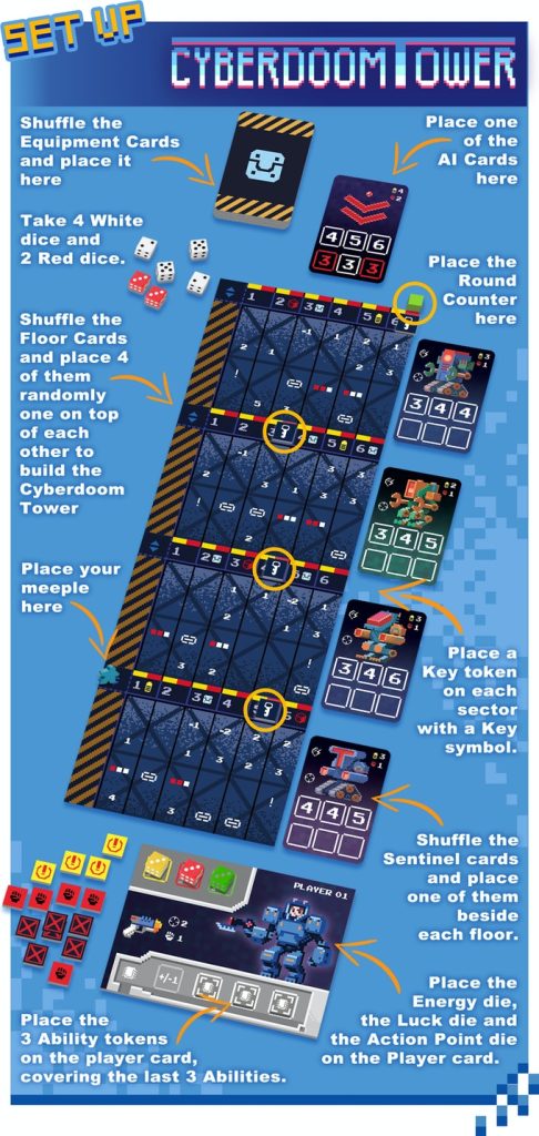 Explore the Cyberdoom Tower, moving between its various floors. Fight against the sentinels that guard it, spending Action Points and using dice to determine your abilities. Upgrade your equipment deck to prepare for the final fight.