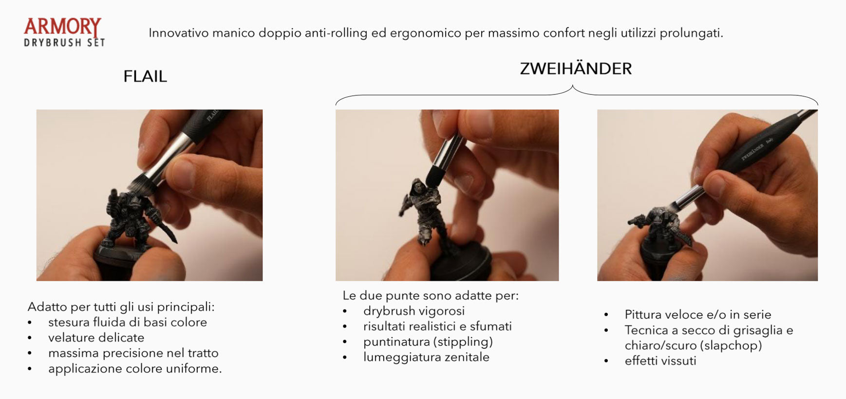 Zweihänder Brush: Double brush designed for drybrushing, stippling and slapchop. Duo oblique fiber on one side, round and compact on the other for soft and realistic effects. Ergonomic anti-rolling grip. With the Zweihänder double brush, thanks to the double synthetic fiber on one side and the soft, compact and elastic bristles on the other, combined with the rounded dome shape, allow a very delicate touch even when performing a vigorous drybrush, offering realistic and delicately shaded results for techniques such as zenithal highlighting and slapchop. Furthermore, it can be used as a brush for stippling on the larger surfaces of large miniatures or vehicles and model kits. Ideal for highlighting edges and blending colors, even on small surfaces.
