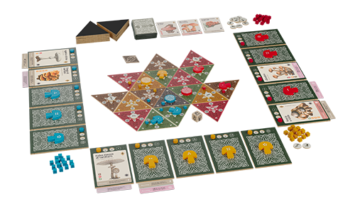Inside the box you will find: 69 mushroom cards , 50 triangular tiles, 4 mother mushrooms, 20 mushroom tokens, 20 spore cubes, 20 player mats, 20 spore counters, 20 insect tokens, 1 wind direction die, 1 end-of-game indicator, 4 summary cards, 10 automa cards, 2 automa summary cards and 1 rulebook.
