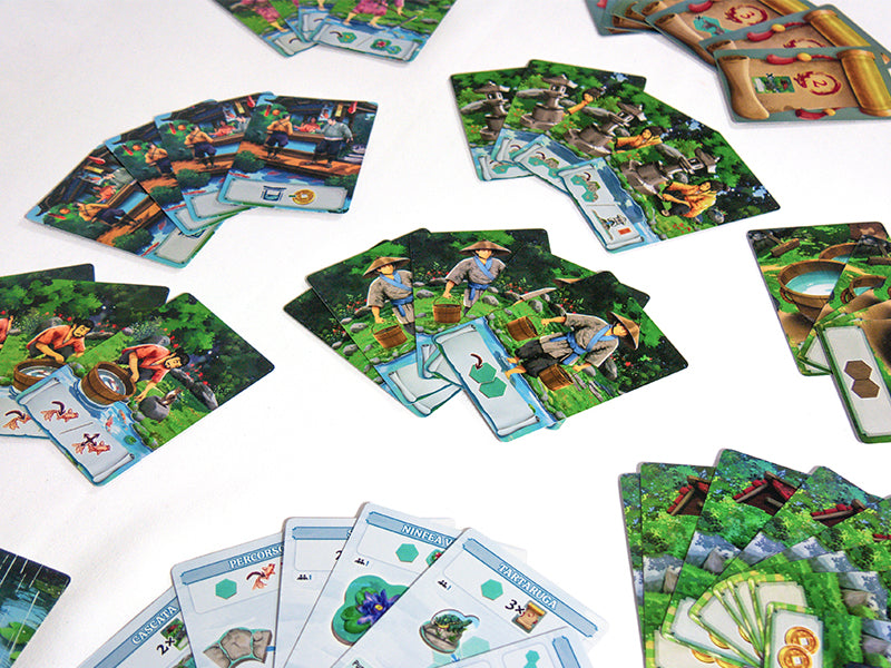A ogni turno puoi scegliere se Lavorare, posizionando nuove tessere e ampliando il tuo laghetto, oppure Meditare, ottenendo bonus strategici che possono fare la differenza nel corso della partita. Completando obiettivi condivisi e ottimizzando il design del tuo giardino, accumulerai punti vittoria mentre costruisci una composizione equilibrata e coerente.
