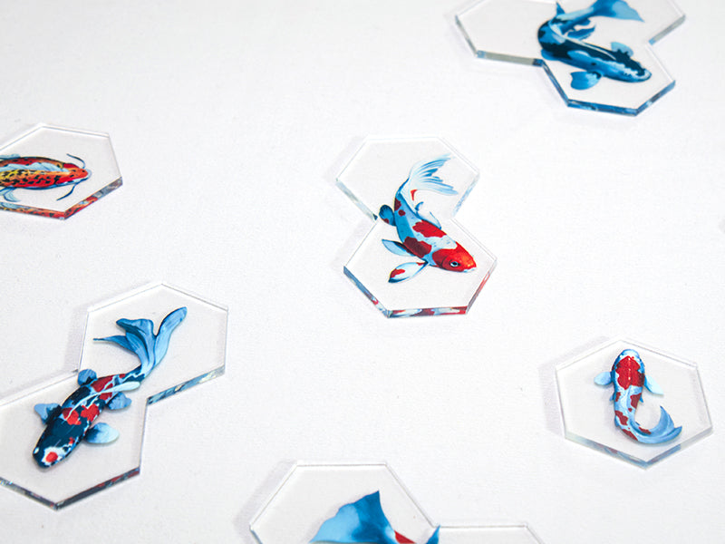 In Koi, i giocatori vestono i panni di allevatori di carpe giapponesi, impegnati nella creazione di un elegante laghetto zen attraverso il piazzamento tessere. Koi, acqua, ninfee, lanterne e altri elementi decorativi prendono forma turno dopo turno, dando vita a un giardino armonioso tanto bello da vedere quanto stimolante da pianificare.