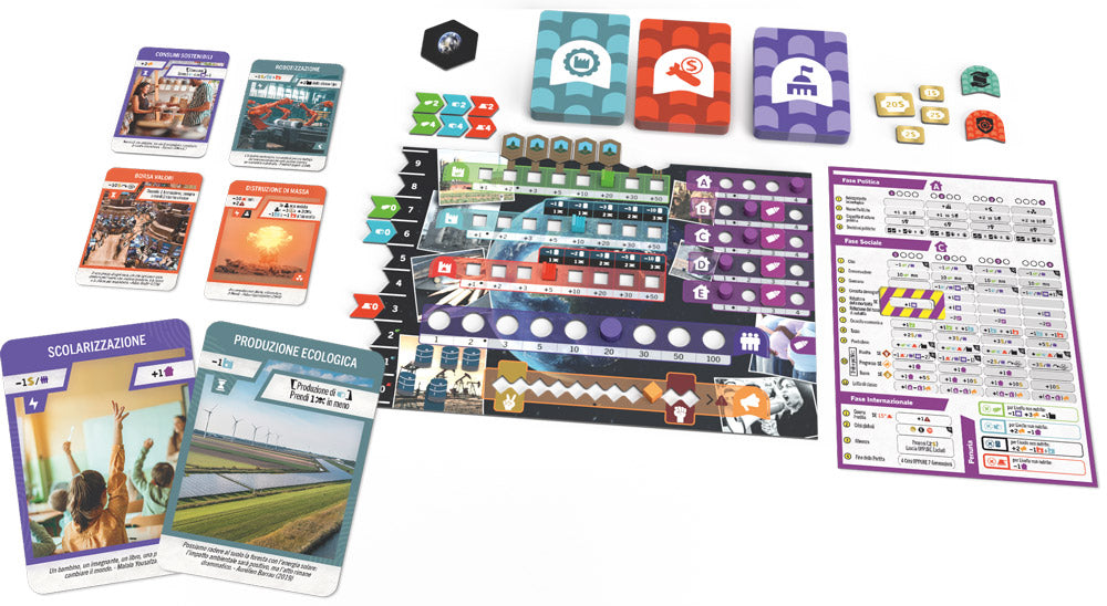 La struttura del gioco si sviluppa in tre fasi principali per ogni generazione. Nella fase Politica pianifichi le tue mosse e giochi le carte, definendo la direzione della tua nazione. Nella fase Sociale la popolazione reagisce alle tue scelte, sostenendoti o mettendo in discussione il tuo operato. Infine, nella fase Internazionale, il mondo entra in fermento tra alleanze, tensioni e crisi globali. Dalla corsa tecnologica alla scarsità di risorse, dalle guerre commerciali ai conflitti armati, ogni turno rappresenta una sfida continua tra stabilità e opportunismo.