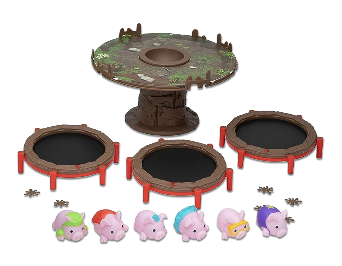 Use the trampolines to bounce the pigs in the pigsty and try to land them in the mud puddle! Each pig you land in the puddle will earn you a mud pie. Bounce your pigs until they run out of mud pies. The muddiest pig wins!