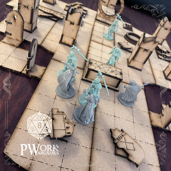 The Temple set includes 14 different modular MDF tiles and 25 elements that can be used to create a battle scenario set in a temple.