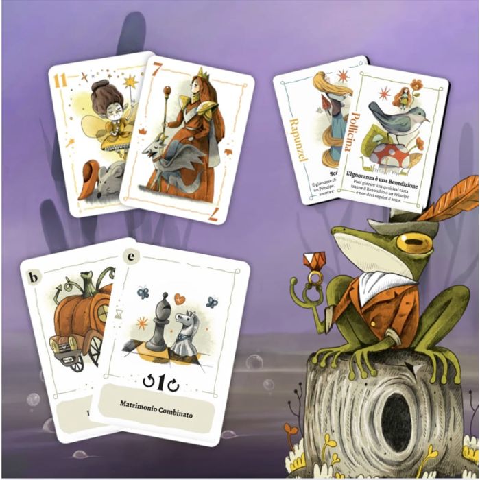 Rebel Princess is played in 5 rounds, and each round introduces a new rule that changes the flow of the game. The game mechanics are inspired by trick-taking games, where each player plays a card for each trick, following one of the 4 suits of the deck (fairies, queens, animals and princes). Whoever plays the highest number in the suit that started the trick will collect all the cards of that trick. But be careful! Players must avoid taking cards with princes, as each of them brings with it a marriage proposal, while the frog brings 5. The player with the fewest marriage proposals at the end will be the winner. In addition, each player will play a fairytale princess with a special ability that will make her unique during the game.