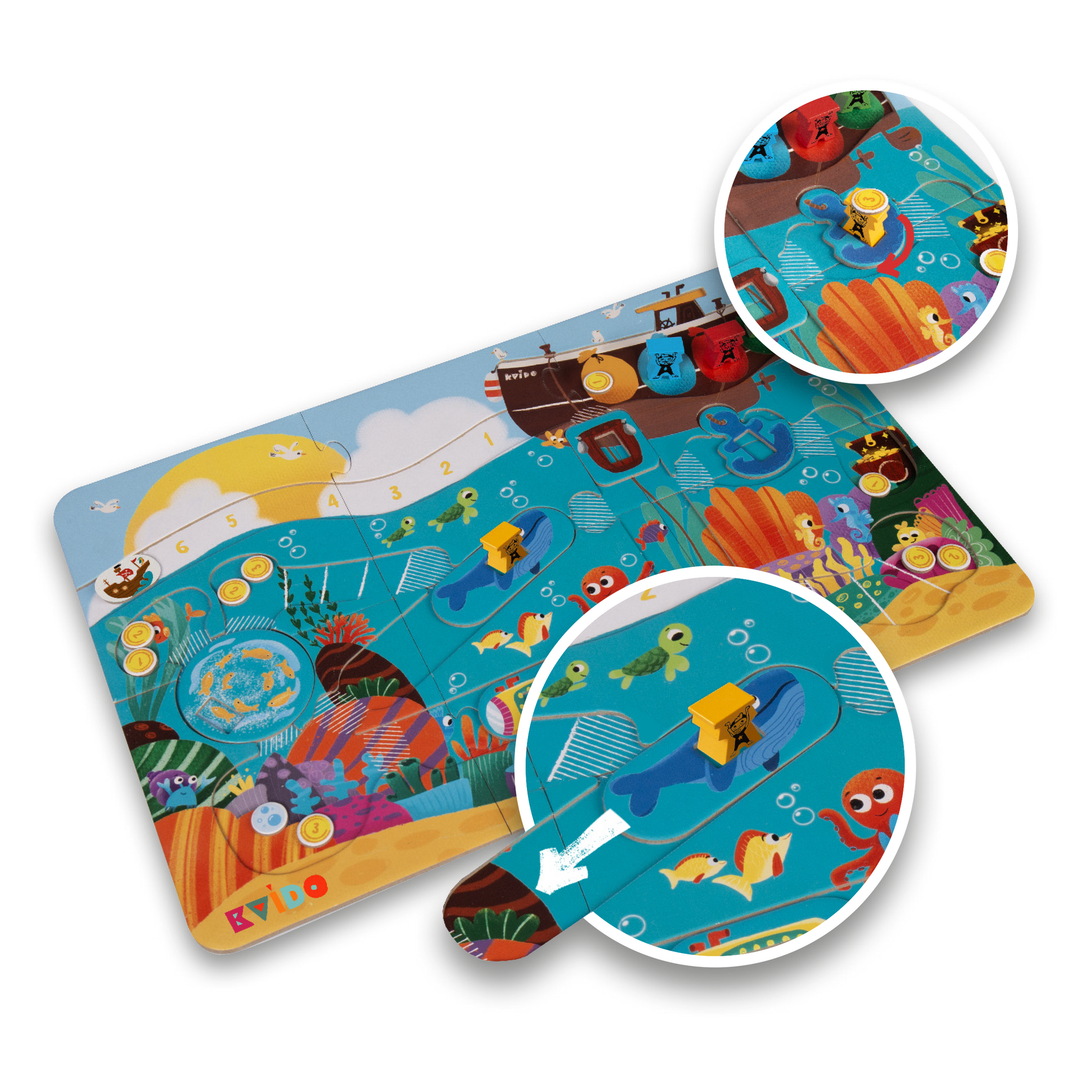 In Treasure Rescue , dive into the ocean depths in search of a precious treasure hidden at the bottom of the sea. To reach it, you can count on five original means of transport, including a whale and an anchor!