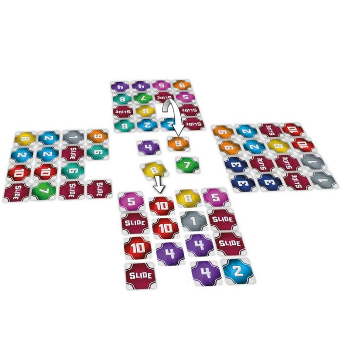 Slide is an engaging card game that challenges players to get rid of their cards to achieve the lowest possible score. Each game is a real strategic challenge, where planning and tactical choices are essential to victory. The game begins with each player receiving sixteen cards, placed face down in a 4x4 grid. The cards range from 1 to 10, with ten copies of each number. This initial layout creates a dynamic and challenging playing field, which will test your skills.