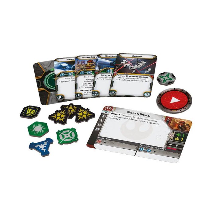 Rebel Soldiers Unit Pack in Italian for the Star Wars Legion miniatures wargame. This reinforcement kit for the Rebel Alliance faction includes a troop made up of 7 Rebel Soldier miniatures, 5 upgrade cards, 9 assorted tokens and 1 rulebook.