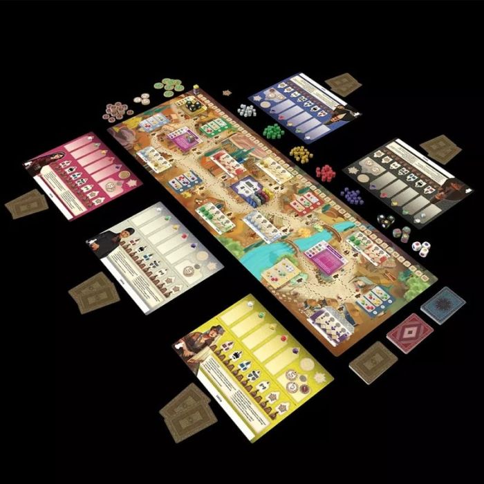 You and your competitors are Persian carpet weavers and traders. In each round, you will move three apprentice tokens around the Grand Bazaar. Look for the best deals when the shops are crowded, visit the traders to stock up on supplies, and take advantage of the specialized stalls at the edges of the market. Deliver materials to complete commissions and earn coins and prestige, improving your talent and unlocking special abilities. The game ends when a player completes their ninth commission or reaches a talent level of 14, at which point the carpet weaver with the most prestige is declared the winner.