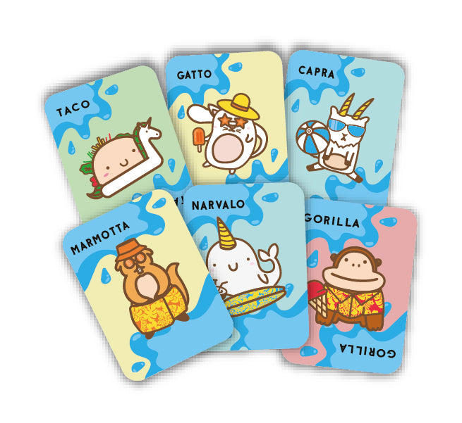 Taco Gatto Capra Cacio Pizza Waterproof is the waterproof version of the famous fast-paced and fun party game , perfect for playing in the pool, on the beach, or during any outdoor adventure! The goal? Get rid of all the cards... without letting them fall into the water !