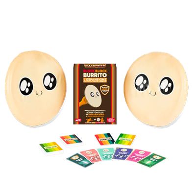 Block Block Burrito porta il divertimento a un livello completamente nuovo, aggiungendo scudi Tortilla gonfiabili per difendersi dai Burrito e Avocado volanti! Il gioco di carte più folle del mondo diventa ancora più spettacolare e competitivo, perfetto per le sfide all’aperto tra amici e familiari.