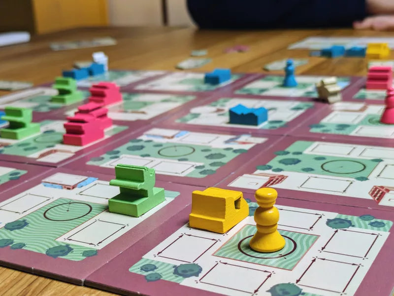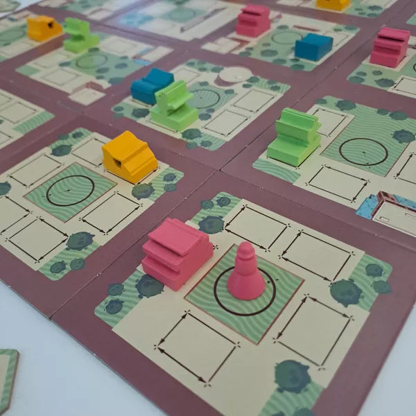 Durante la partita potrai muovere il tuo Architetto sulla mappa modulare e costruire edifici colorati nei lotti adiacenti agli incroci, influenzando le possibilità future di tutti i giocatori. In alternativa, potrai acquisire Carte Progetto, che definiscono schemi specifici di colori e forme da completare sulla mappa per ottenere Punti Prestigio. La gestione della mano e la capacità di creare combo efficienti sono elementi chiave per massimizzare il punteggio.
