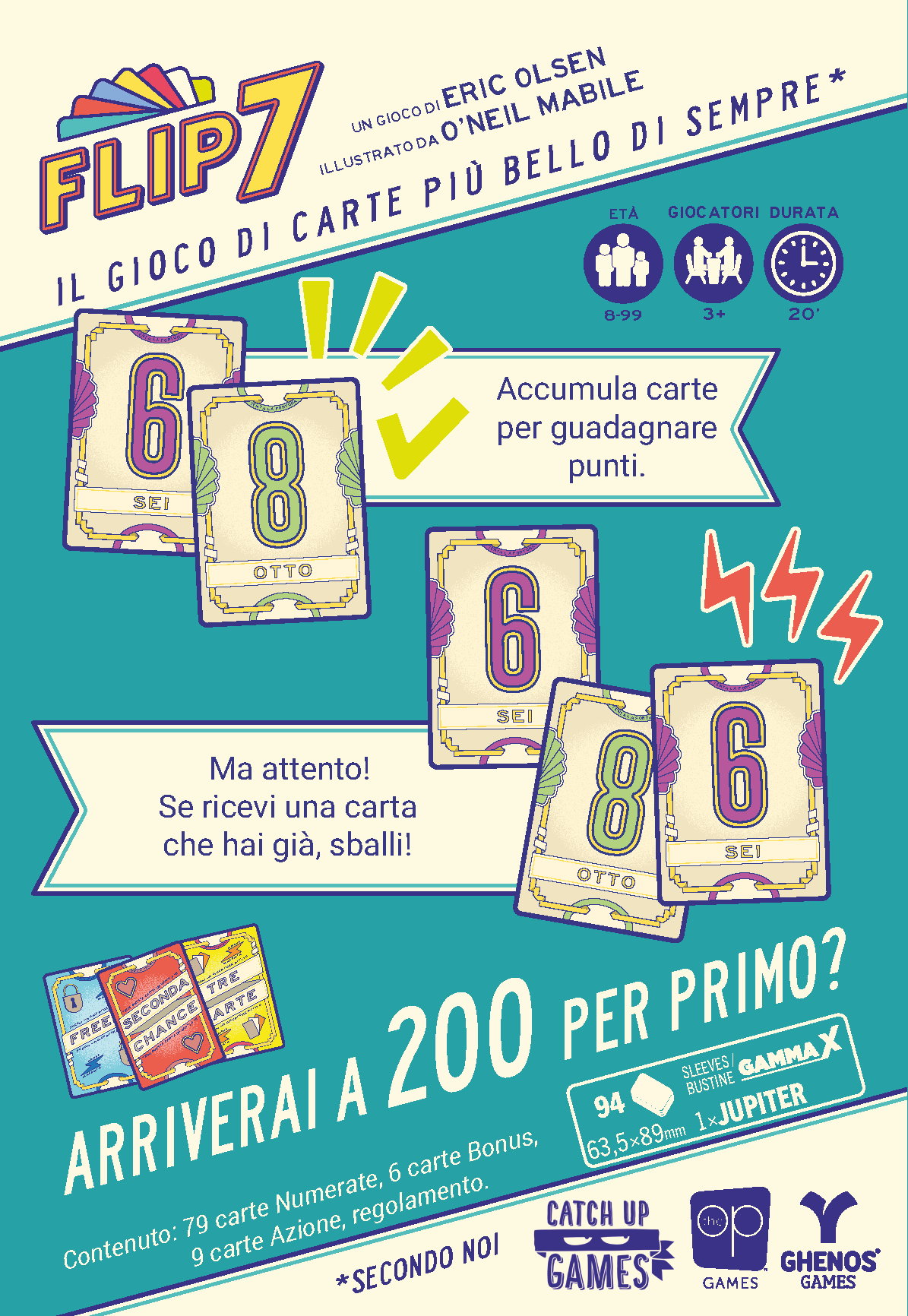 Grazie alla presenza di carte Bonus e carte Azione, ogni partita è piena di colpi di scena e momenti imprevedibili. Con regole semplici e rapide da spiegare, Flip 7 è ideale per ogni serata e perfetto per i gruppi numerosi che cercano un gioco veloce, divertente e ricco di tensione.