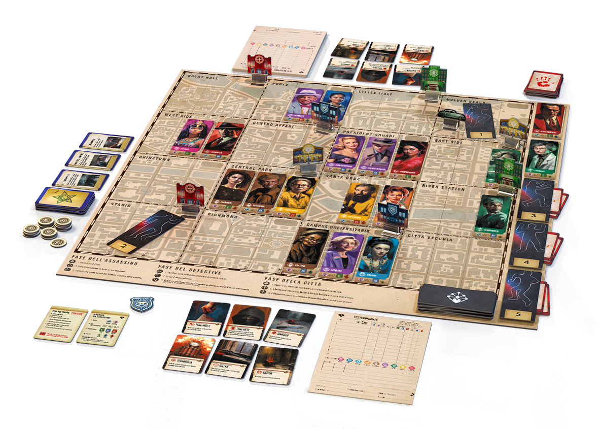 Il detective, invece, dovrà raccogliere prove, interrogare i testimoni e formulare domande mirate su età, corporatura, sesso e statura del colpevole. Attraverso sorveglianza, trappole e sottili giochi mentali, cercherà di smascherare l’assassino prima che completi il suo piano. La partita si sviluppa in un massimo di 6 round, in un crescendo di tensione che culmina nello scontro finale tra le due fazioni.