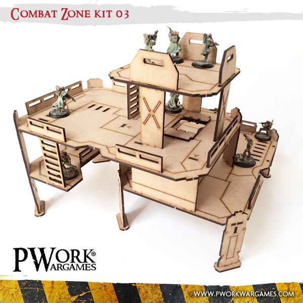 Il kit contiene 4 elementi scenici in MDF 3mm (1 edificio a tre piani, 2 rampe/corridoi di camminamento e 1 rampa/corridoio piccolo), da assemblare e dipingere.