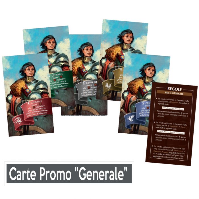 Il pack comprende 5 Carte Promo "Generale" per il gioco Orifiamma con il relativo regolamento. Le carte "Generale" appartengono a un'edizione speciale a tiratura limitata.
