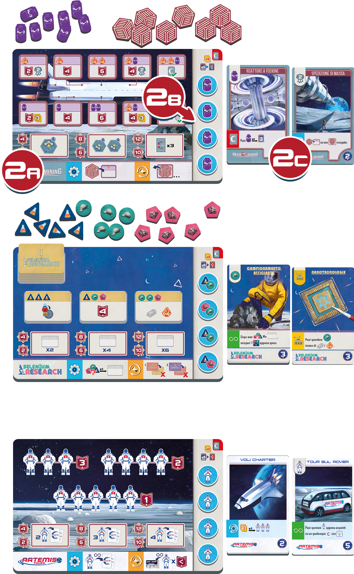 👨🚀 Fase Azioni – il cuore del gioco: schiera i tuoi astronauti sulla Luna per raccogliere risorse, costruire strutture o finanziare progetti.