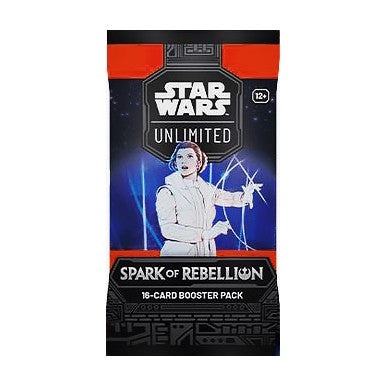 - 1 pacchetto di Star Wars: Unlimited - Scintilla di Ribellione, contenente 16 carte, di cui almeno una rara o leggendaria e tre non comuni