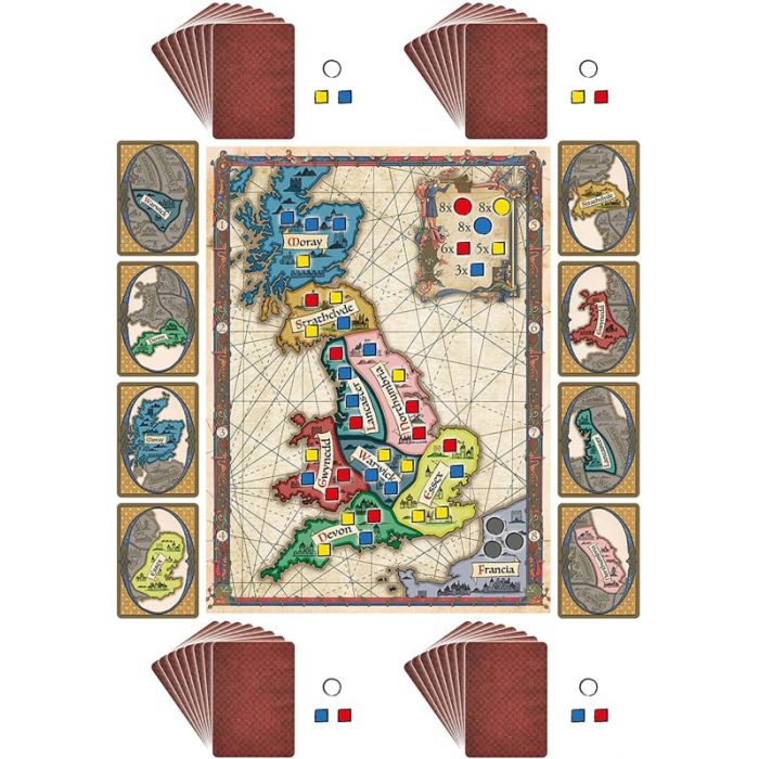 Durante la partita, i giocatori risolvono conflitti nelle otto regioni dell’isola, decidendo quale fazione prevarrà. Ogni scelta conta: formare alleanze, tradire al momento giusto o sostenere la fazione dominante può determinare il destino della Britannia. Solo chi avrà l’appoggio del vincitore potrà reclamare il trono.