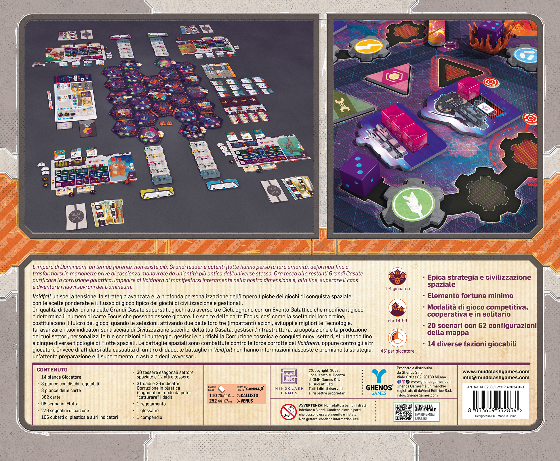 Guida la tua flotta stellare per reclamare settori dominati dai nemici o infestati dal Voidborn. Ogni turno scegli una carta Focus per attivare potenti azioni strategiche, combinabili tra loro con l’uso di carte Programma e segnalini Scambio. Le carte Programma ti offrono modi unici per guadagnare Influenza, che sarà cruciale per il tuo successo.