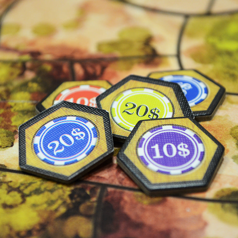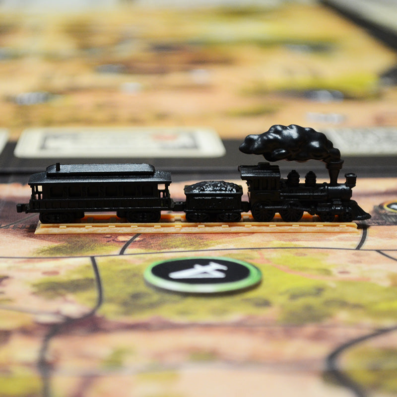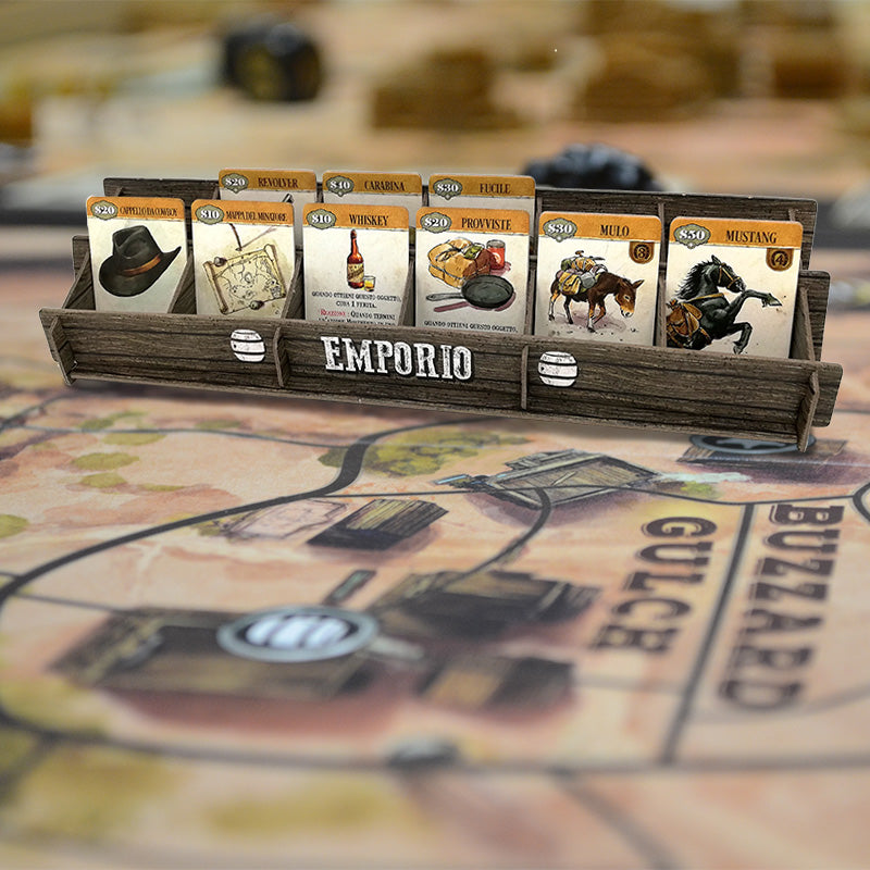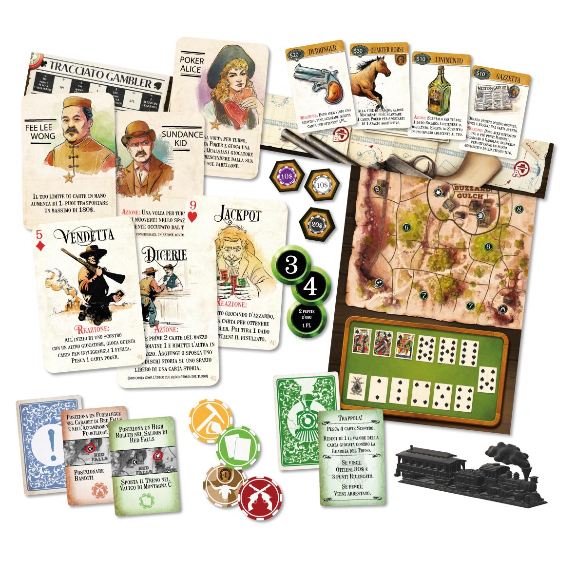 Questa scatola introduce nuovi concetti di gioco: le carte Evento, differenti modi per giocare d’azzardo, nuovi luoghi ancora più a Ovest, il tracciato Gambler e il Treno.